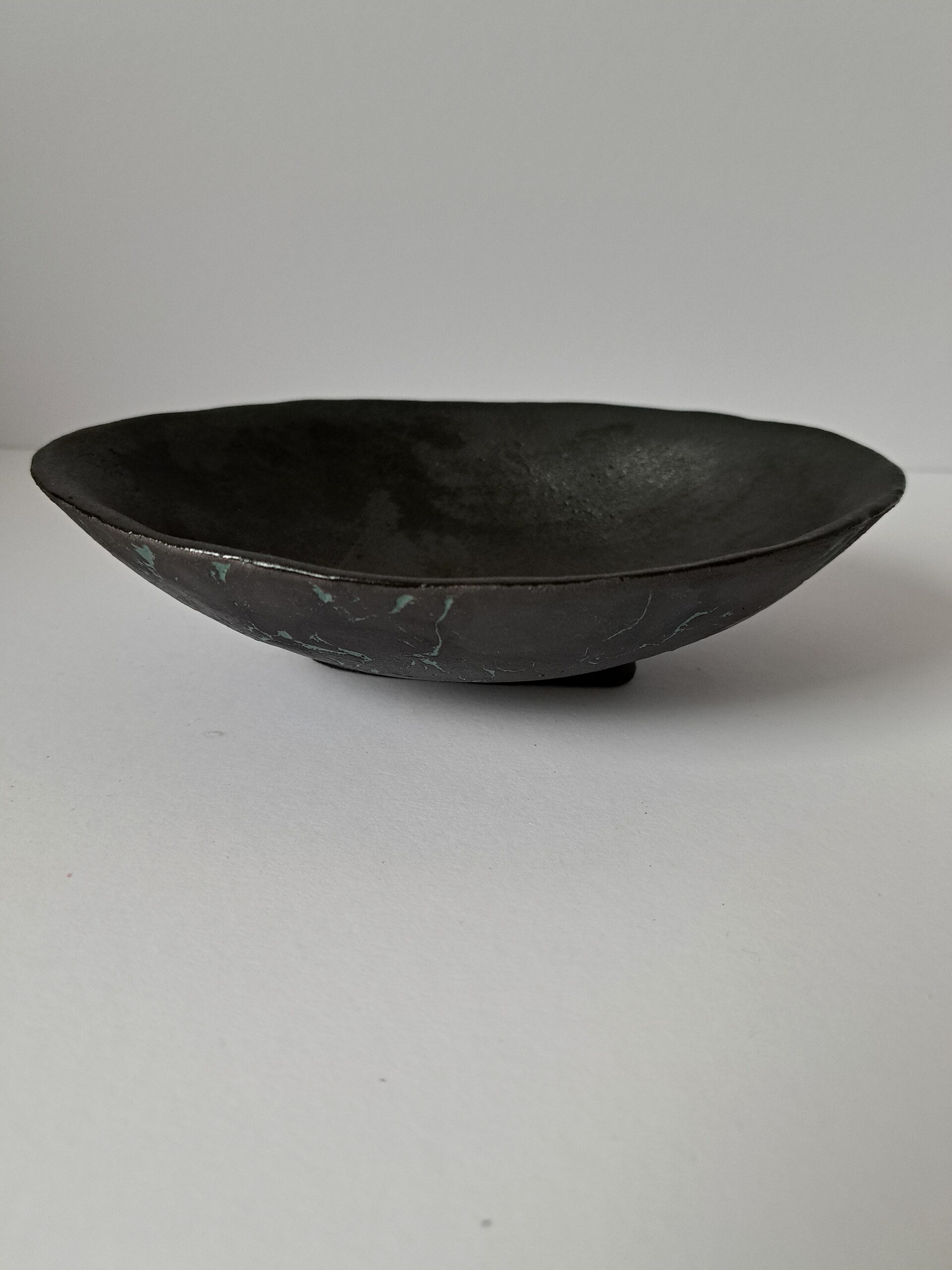 Elektrobrand 1250°, schwarzer Steinzeugton, Engobe, innen glasiert, B 17cm, H 4,5cm